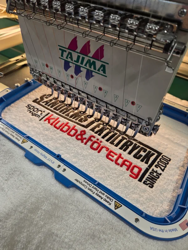 Brodyrmaskinen fungerar egentligen precis som en vanlig symaskin, men med skillnaden att istället för att som på en symaskin, manuellt mata in tyget, så spänner vi fast det i en ram som sedan maskinen sköter om att flytta fram och tillbaka tills alla stygn är sydda.