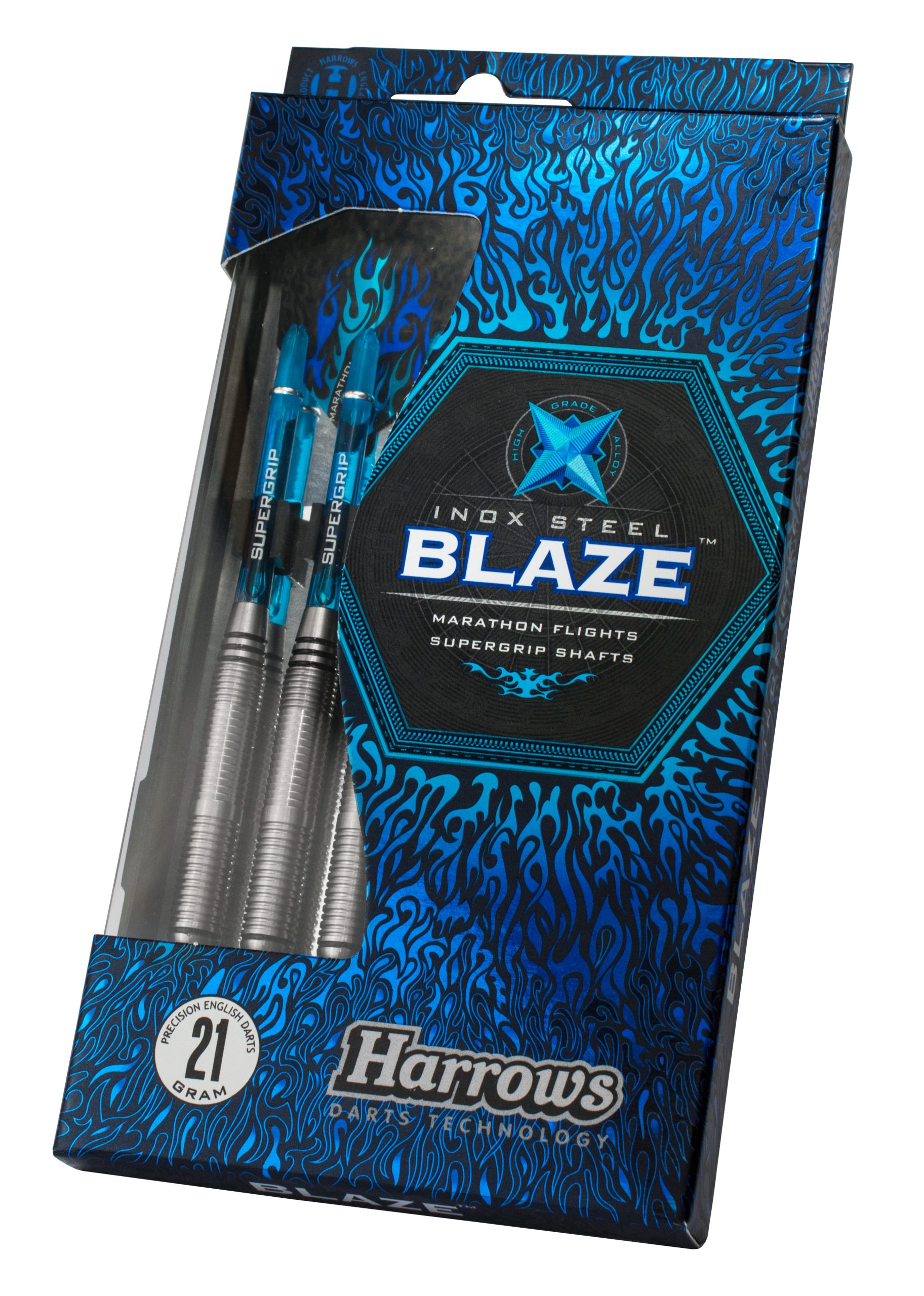Blaze pilarna är tillverkade av rostfritt stål med en järnlegering med hög kolhalt. Det smala och snygga greppet har en unik kombination av horisontella och omvända mikrospår för optimal kontroll. Supergrip pinnar och Marathon flights gör pilarna exakta och aerodynamiska.